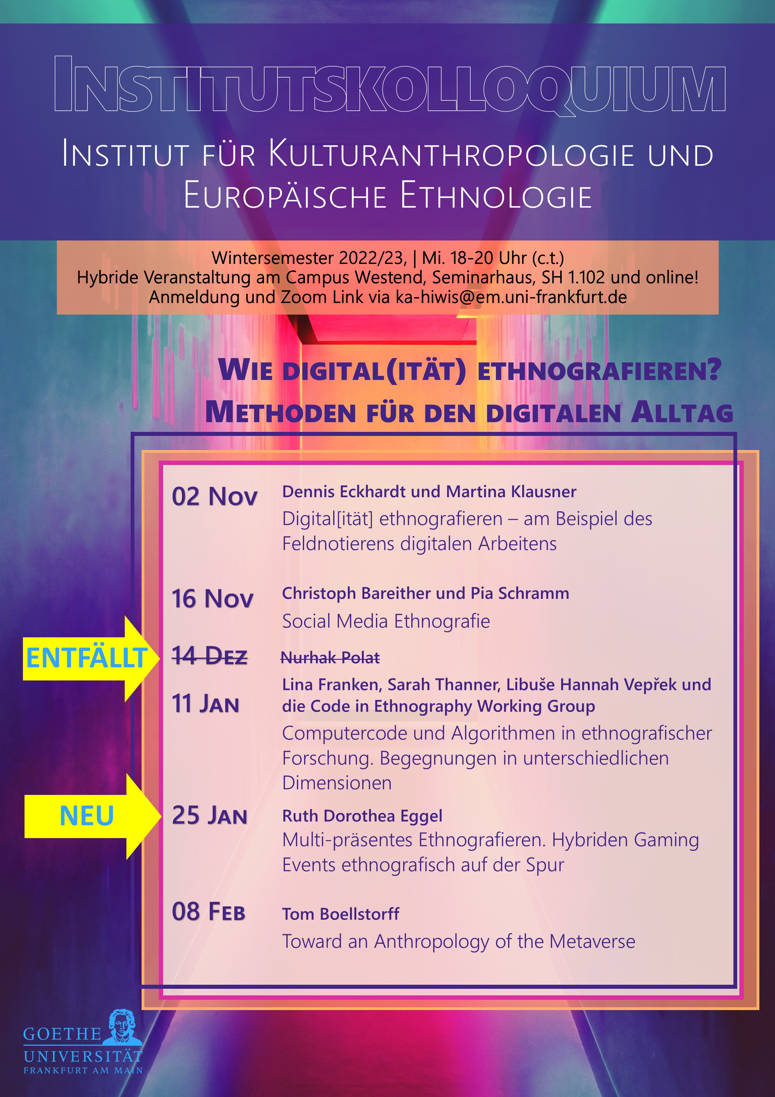 Es haben sich Änderungen im Programm des Institutskolloquiums ergeben. Der Termin am 14. Dezember mit Nurhak Polat entfällt leider, doch dafür haben wir eine neue Veranstaltung mit Ruth Dorothea Eggel geplant.