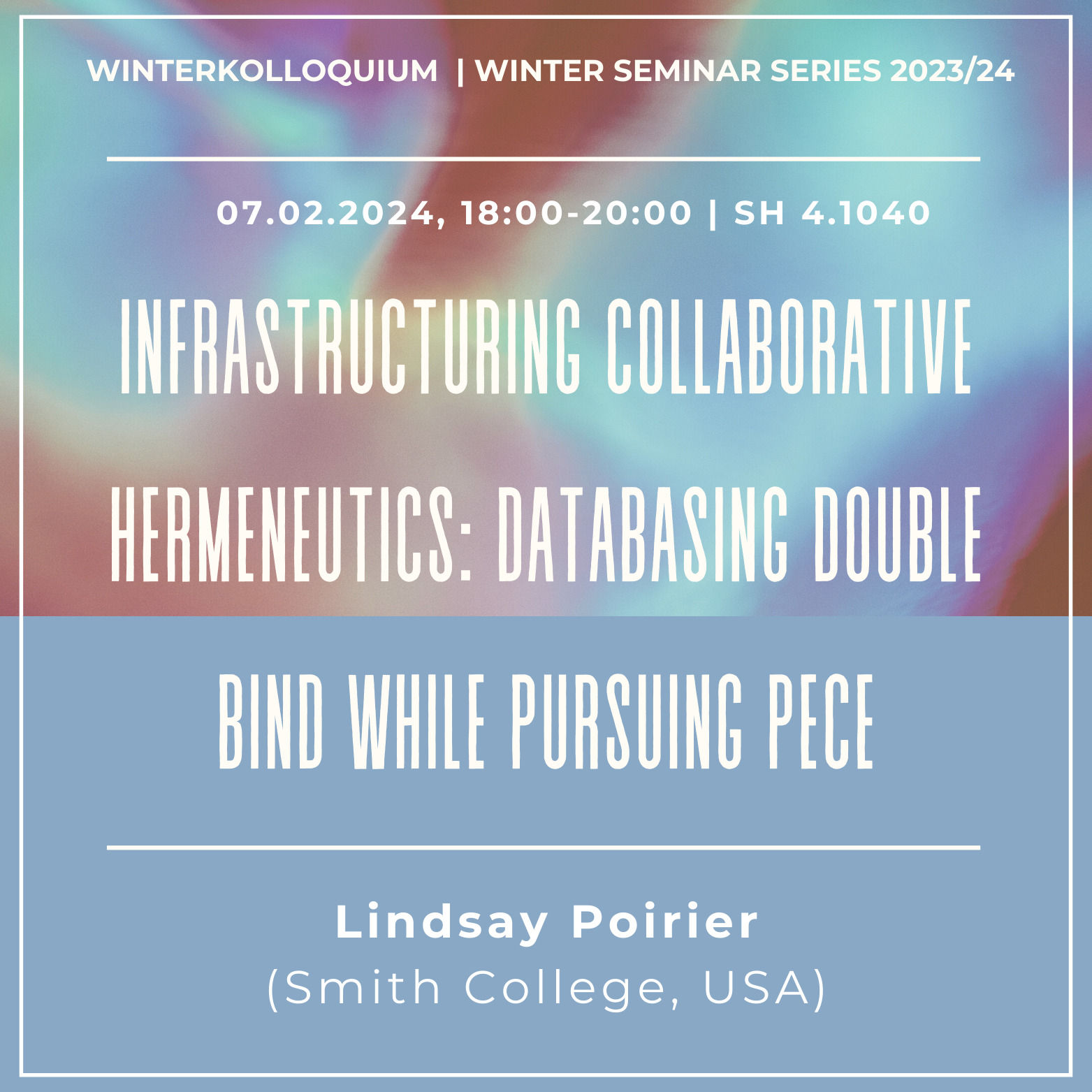 In this talk, I will narrate the tensions of designing the Platform for Experimental Collaborative Ethnography (PECE) a software distribution for supporting multi-sited and multi-perspectival ethnographic research. In particular, I will discuss the architectural challenges to designing data storage systems, interfaces, and workflows that foster collaborative analysis while leaving ethnographic data open to productive reinterpretation. NOTE: The colloquium organisers are going to host a workshop with Lindsay Poirier around her talk, to learn more about PECE from her perspective and practically engage with the functions and options of PECE. Check out our website for updates on this workshop.(To participate online, please send an email to our student assistant Sarah-Lisa Beck: Sa.Beck@em.uni-frankfurt.de ,We will then send you the link shortly before the event.)