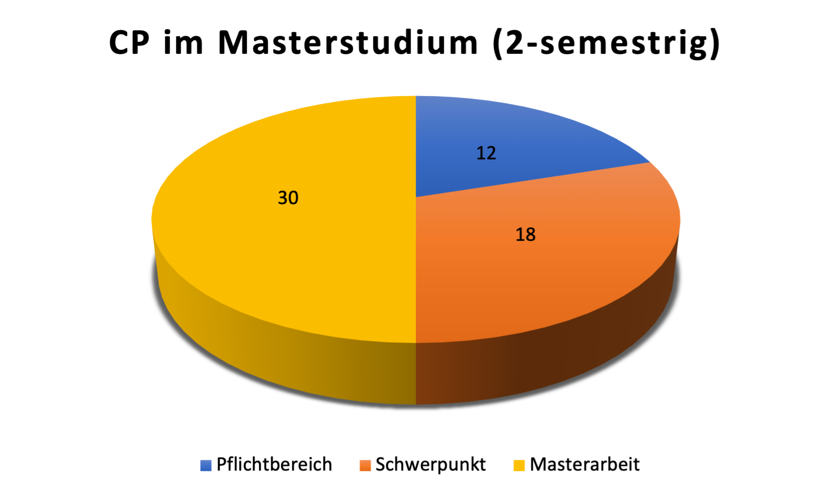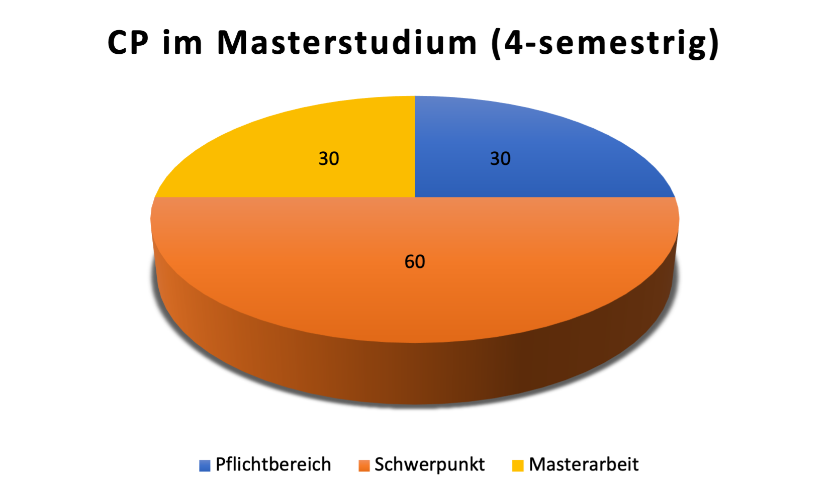 Neben dem gewählten Schwerpunkt müssen außerdem 12CP im 2-semestrigen bzw. 30 CP im 4-semestrigen Master im allgemeinen Pflichtbereich belegt werden. Die Masterarbeit wird mit 30CP angerechnet.