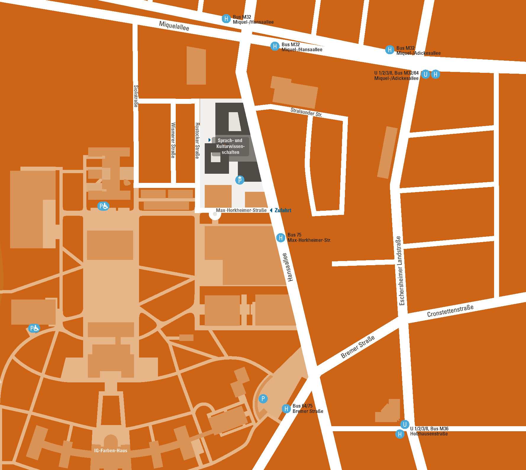 Station „Max-Horkheimer-Straße“ (Seminarhaus, SKW, PEG & ExNO) mit Buslinie 75 von Bockenheimer Warte (6 min).