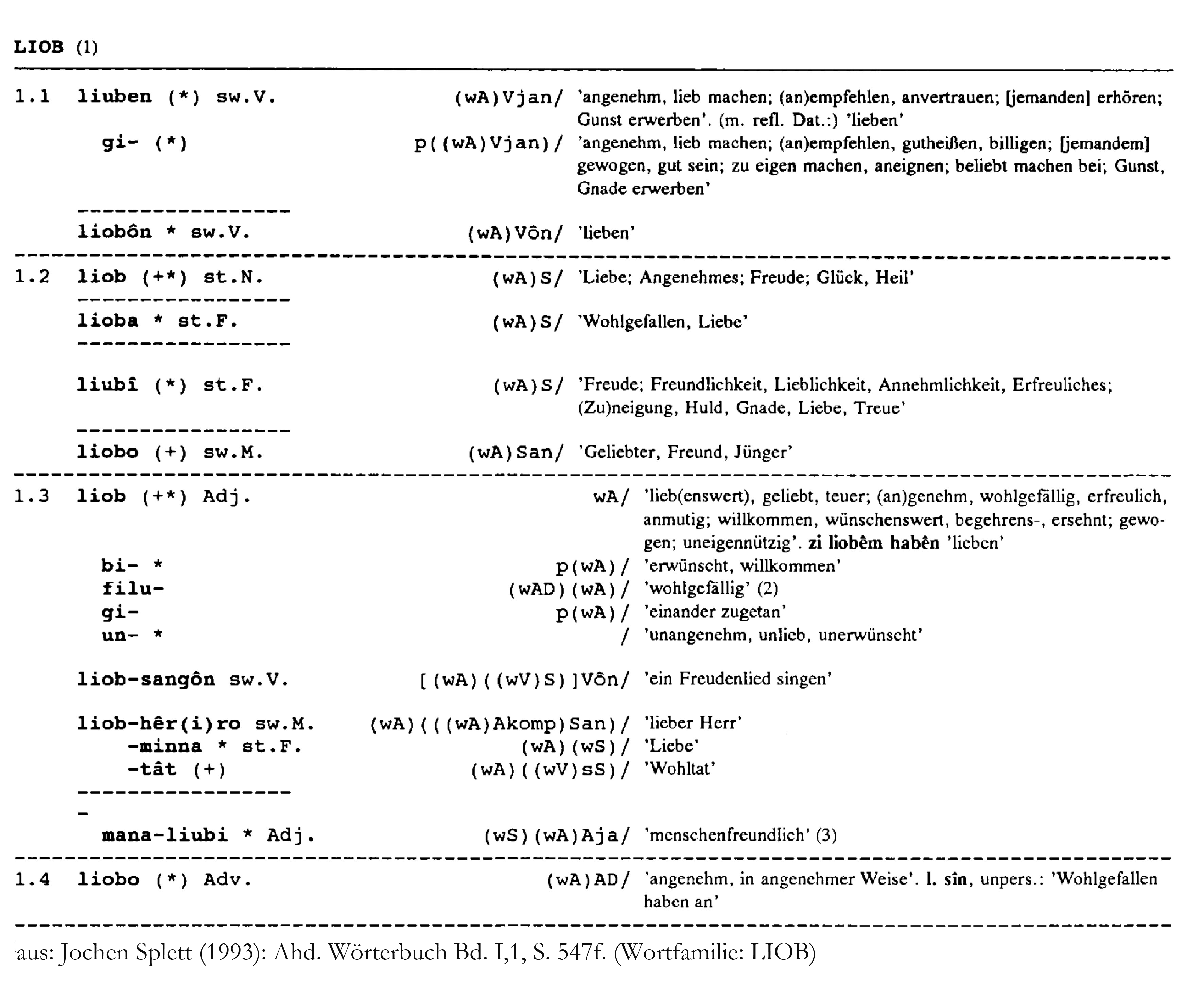 Die vier Teilwortschätze werden durch geeignete halbautomatische Methoden vollständig hinsichtlich ihrer Wortbildung analysiert; das Ergebnis wird für jedes Wort in einer hierarchisierten Strukturformel festgehalten. Vorbild für die Wortfamilienstruktur, die im Projekt erarbeitet werden soll, ist das Wortfamilienwörterbuch von Jochen Splett zum Althochdeutschen.