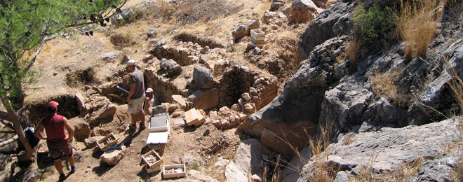 - In dem natürlich belassenen Bereich nordöstlich der Wohninsulae, der sich durch Hangstufen, Felswände und schmale Erdterrassen auszeichnet, im sog. östlichen Felsheiligtum, wurde von 2007 bis 2011 gegraben. Das Areal ist als eine dichte Folge von architektonisch differierenden, stets einfachen Bebauungsstrukturen zu beschreiben, denen auch eine funktionale Verschiedenheit zugewiesen werden kann. Die einzelnen Ausstattungselemente wie der Eingangsbereich, einer Plattform, die Wasserkanäle und -rohrleitungen, Votivdeponierungen, Felszwickeln, z. T. mit Altar-ähnlicher mittiger Steinsetzung und, mehrere Hangstützmauern in dem felsigen Gelände lassen sich zu einem Komplex zusammenfügen, der als Naturheiligtum angesprochen werden darf. Womöglich sind hier mehrere Gottheiten verehrt worden, die nicht zum städtisch-institutionell verehrten Götter-Ensemble gehörten.