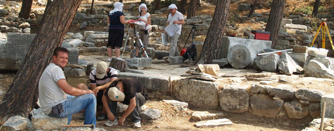 Ferner wurde die regelmäßige Bearbeitung besonderer Materialgruppen durch Wolfgang Blümel, Hans-Ulrich Wiemer und Daniel Kah (Epigraphik), Selma Gün (Skulpturen), Frank Rumscheid (figürliche Terrakotten) und Bernhard Weisser(Fundmünzen) fortgesetzt. Die anthropologische Untersuchung der Skelette von byzantinischen Bestattungen aus der Nekropole beim Heiligtum der ägyptischen Götter wurde von Wolf-Rüdiger Teegen durchgeführt, die Tierknochenanalyse durch Norbert und Almuth Benecke.
