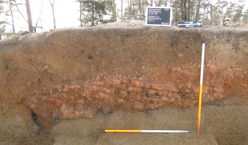 2) Die Böden innerhalb der Befestigungsanlage sind stark durch den menschlichen Einfluss verändert. Statt Braunerden kommen Kolluvisole vor, welche sich in verschieden alte kolluvialen Ablagerungen gliedern lassen. Schichten und Horizonte der Böden in den archäologischen Grabungen sollen bodenkundlich zu beschrieben werden sowie Paläooberflächen, Laufhorizonte und verschiedene Nutzungsbereiche (wie z.B. Stall, Herd, Produktionsort) mit mikromorphologischen Analysen identifiziert. Unter den verziegelten Strukturen sind ungestörte Paläooberflächen erhalten, die systematisch beprobt wurden und bodenchemisch und –physikalisch untersucht werden sollen( pH, org. Sub., Korngröße, Gesamtphosphat, Metalle u.a.). Eben diese Methoden sollen auch bei Sedimentummantelung des Goldfundes und der Bernsteine angewendet werden, um über die Zusammensetzung, Mikrogefüge und pedogenen Merkmale einen Beitrag zur Klärung von Herkunft und Alter dieser herausragenden Funde zu leisten.