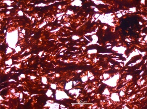 | Schnitt durch die verbrannte Befestigungsanlage (links) und Mikrograph des verziegelten Materials (rechts) (Grabungsschnitt 3, Goethe Universität). |