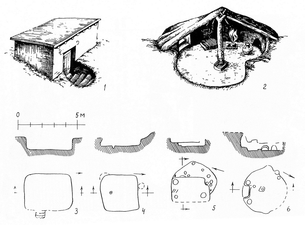 | Olbia. Kernstadt. Grubenhausstrukturen archaischer Zeit. Rekonstruktionszeichnung (nach Vinogradov/Kryžickij 1995 Abb. 10). |