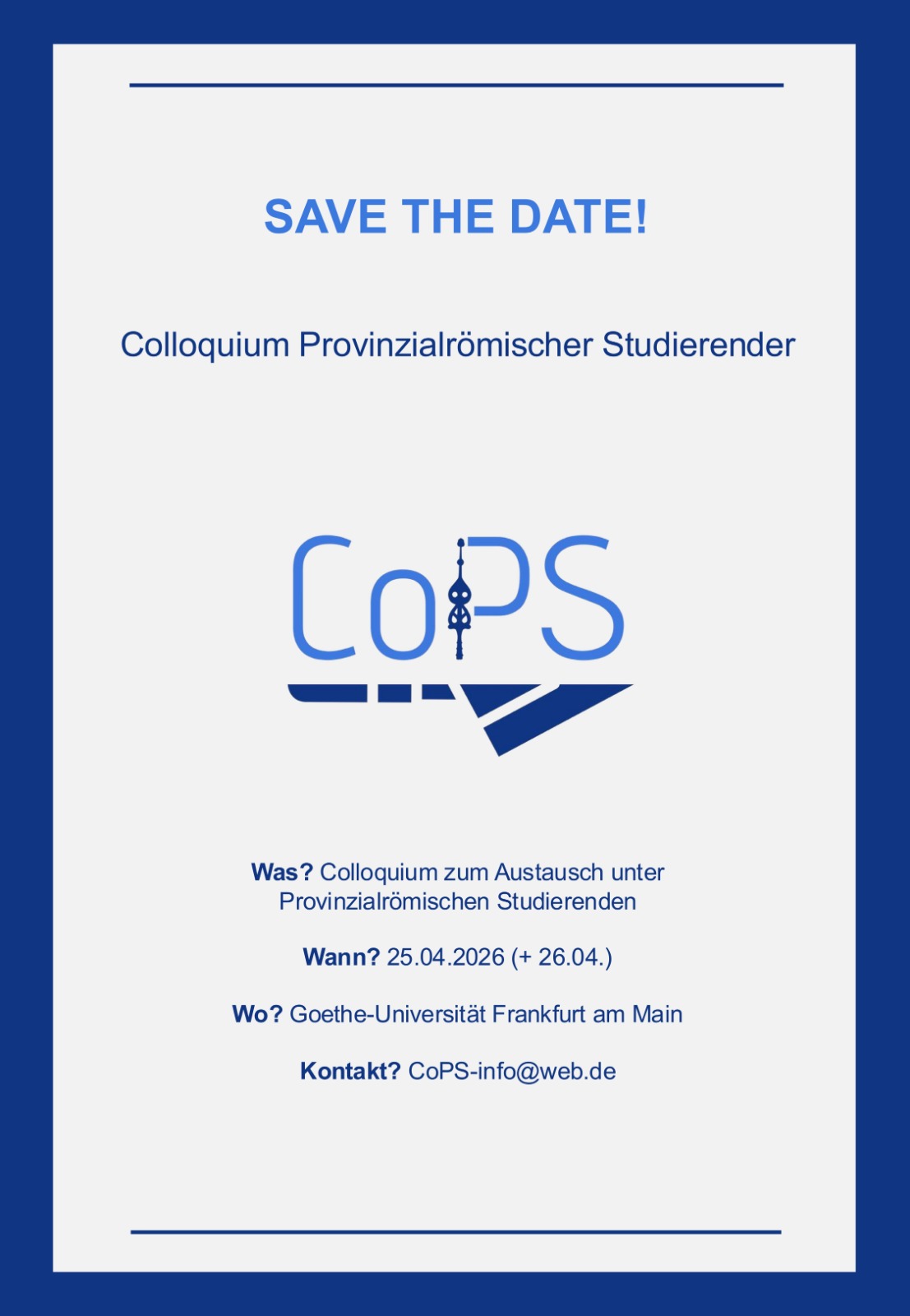 Unter diesem Motto steht CoPS- das Colloquium Provinzialrömischer Studierender. Das Colloquium findet erstmals am 25.04.2026 an der Goethe-Universität Frankfurt am Main statt und wird von Studis für Studis organisiert. Am 26.04.2026 wird eine fakultative Exkursion stattfinden.
